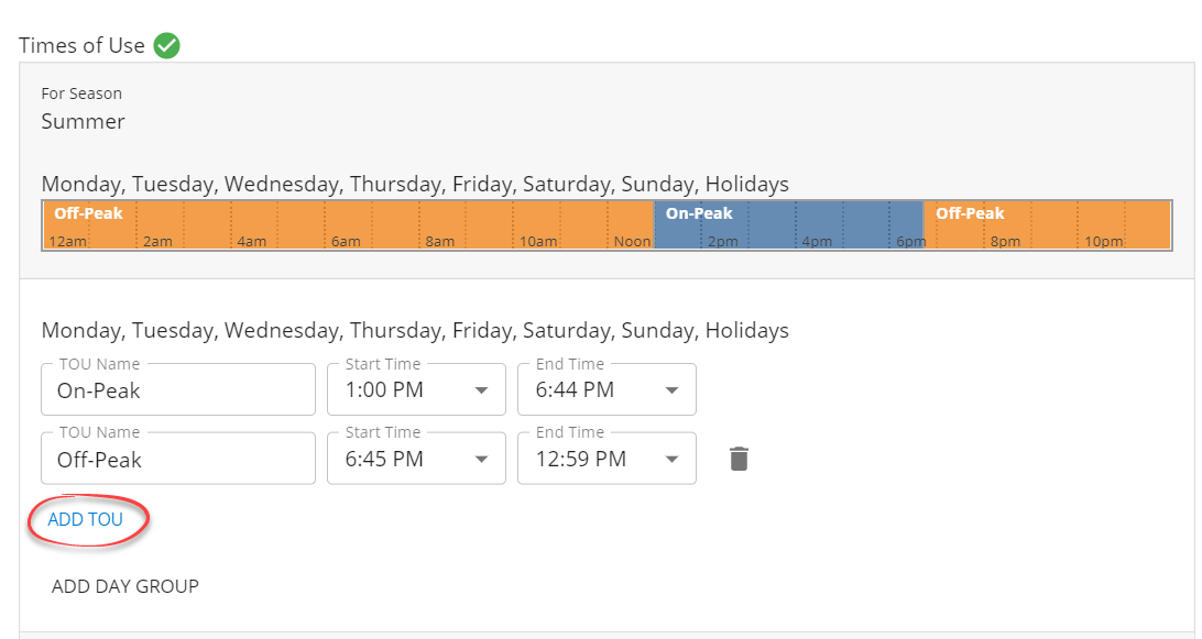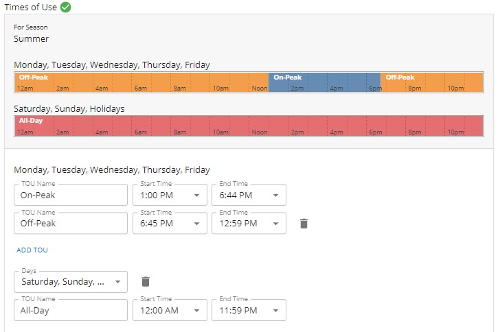 For each defined season, you must specify one or more TOU. By default, the first TOU you specify will apply to all days of the week.