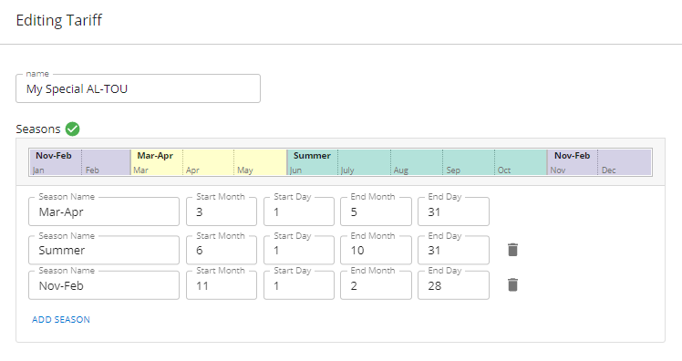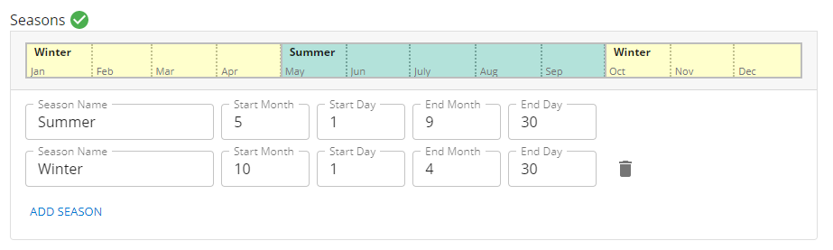 Seasons are specified by providing a name and setting the start and end month and day. Use one or more seasons to cover the full 12 months. For example, we can specify that the Summer season begins on May 1st and ends on September 30th and Winter begins October 1st and ends April 30th.