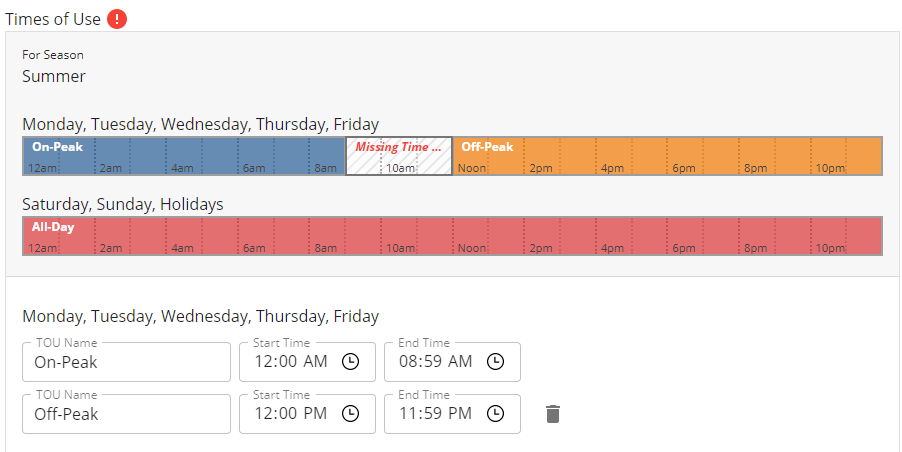 As with the seasons, the interface will alert if there are overlapping or missing TOUs. This example shows that nothing is defined from 9 AM to Noon during the week.