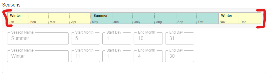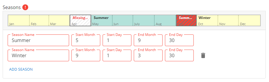 The timeline view at the top of the section will alert if there is an overlap or missing months. In this example, there are two alerts because both Summer and Winter include September, and no season is assigned to the month of March.