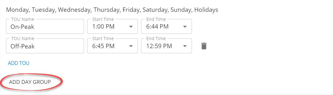 To create a special TOU that only applies to a subset of the days of the week (most commonly weekday vs weekend/holidays), Add a Day Group. Select multiple days for this group by using Ctrl + click in the dropdown provided.