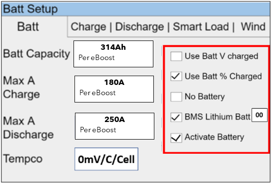 a) If closed loop communication is set up correctly, enabling 'BMS Lithium Batt 00' will adjust some values automatically. In this tab, those would be 'Batt Capacity' and 'Tempco'.