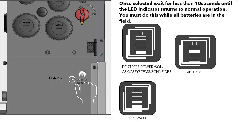 3. Press the Power button. Make sure to select the correct inverter protocol by holding the power button for 5 seconds after initiating the battery.