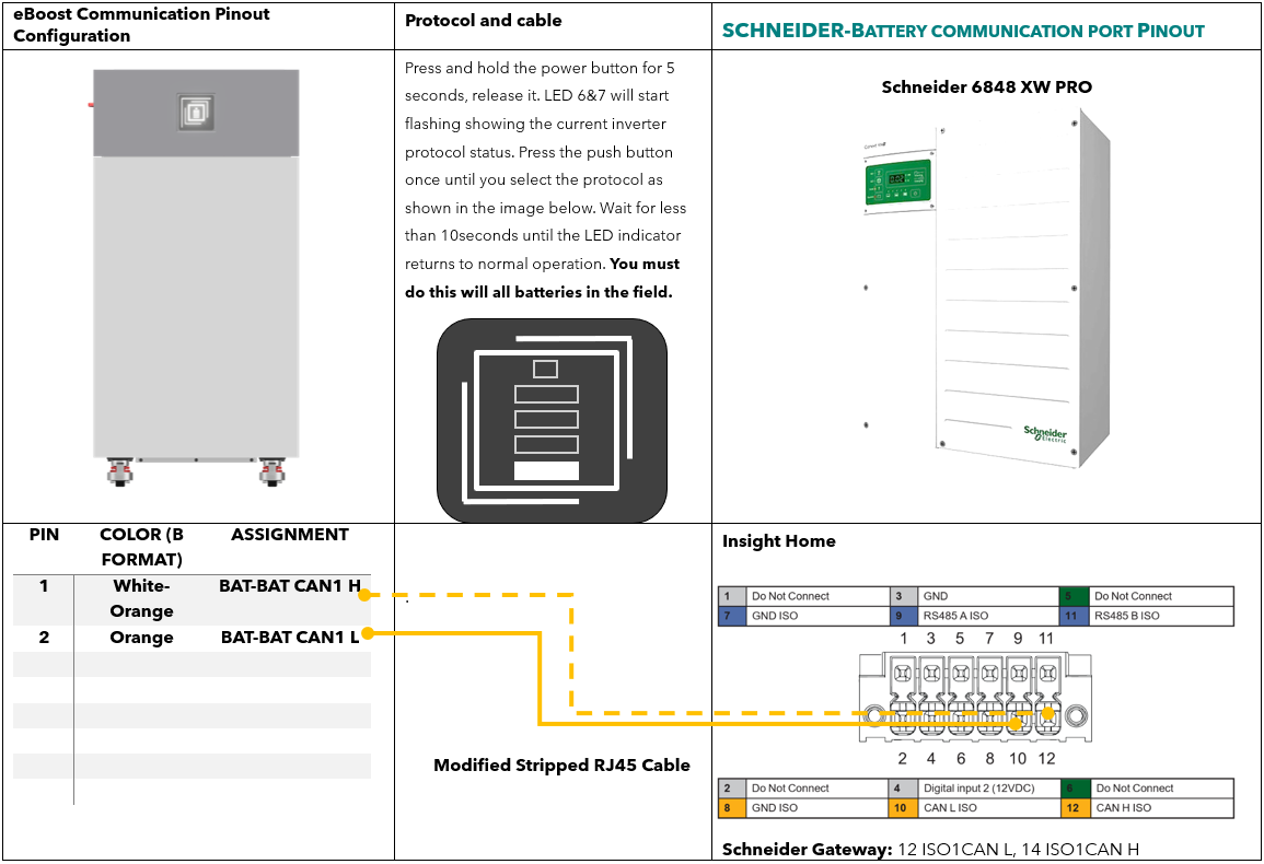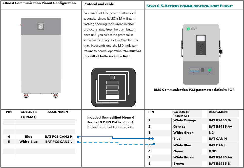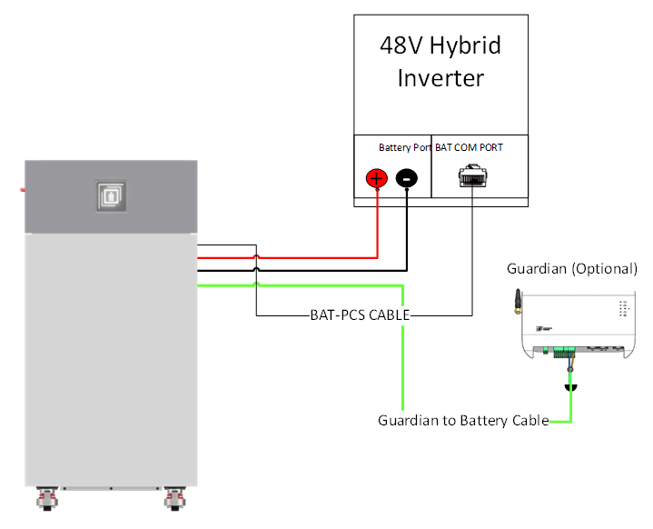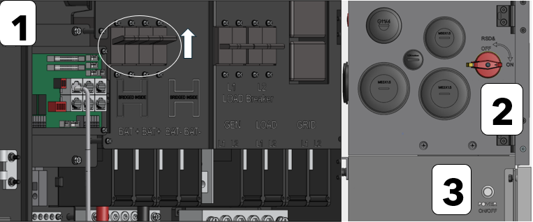 Plug one side of the BAT-PCS cable into the RJ45 ports of the Communication board and the other side into the inverter BAT COM port. RSD features include complete system shut off by disconnecting the batteries voltage output, Disabling PV Voltage, and Load Output per NEC 2023 Code. To achieve this, Follow the connections in the above image.