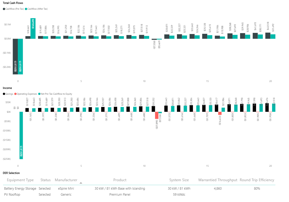 Report - Summary Section This page provides top-level financial and equipment information for the modeled scenario. The summary includes cost and savings breakdowns, project location or uploaded site plan, total system power and storage capacity (if ...
