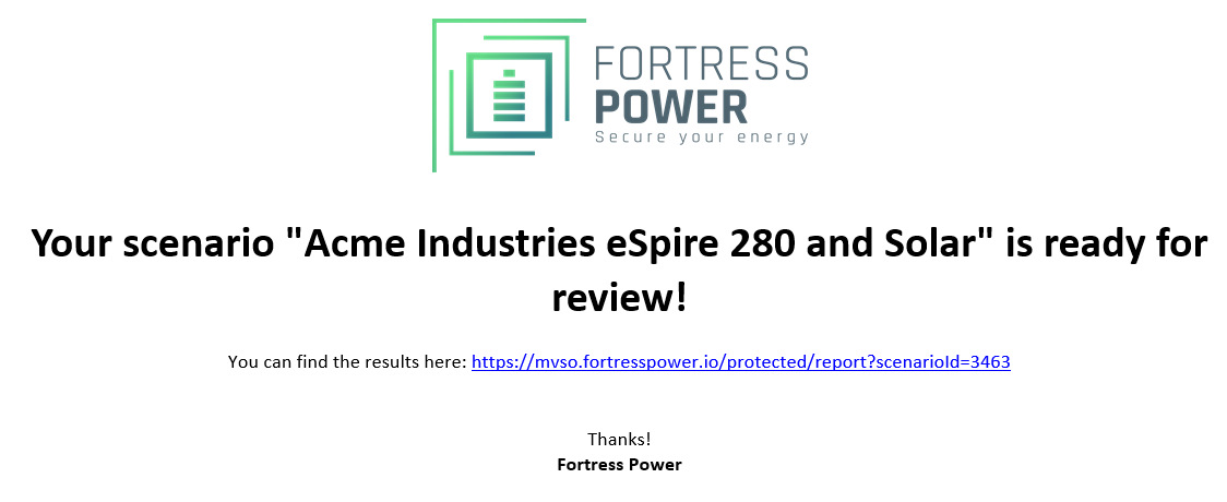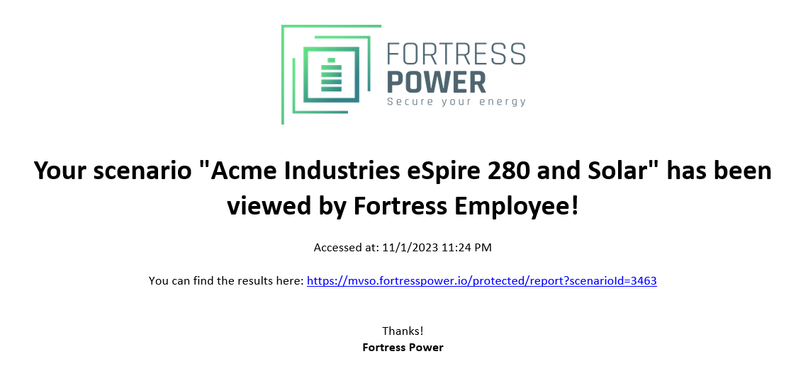 When a customer views the shared report for the first time, the scenario status will change to Viewed and be timestamped, and the analyst who shared the scenario will be sent an email: