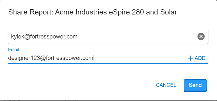 Share: send an email to your customer or additional interested parties with a link to the report. If the report has not yet been shared to the contact associated with the project, that contact will appear by default in the share dialog. You may also add more interested parties by their email addresses: